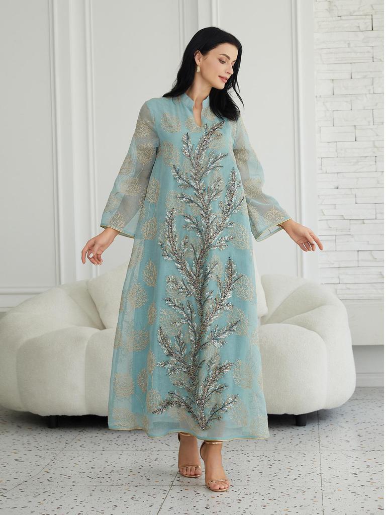 This elegant women’s plus size abaya dress combines the sophistication of Middle Eastern and Western styles. Crafted from high-quality polyester, the dress features exquisite embroidered sequin detailing, adding a touch of glamour to any occasion. The flowing silhouette offers both comfort and style, making it a versatile piece suitable for various events. Perfectly balancing tradition with contemporary design, this abaya dress is a standout addition to any wardrobe.