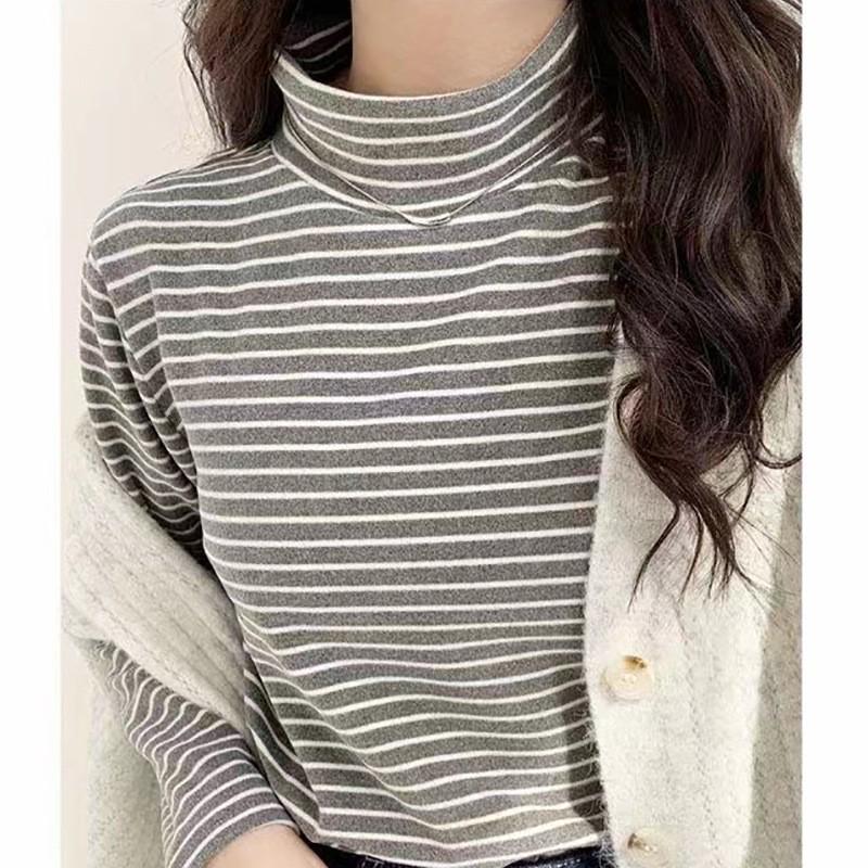 Women's Striped Velvet Mid-Neck Pullover - Autumn/Winter Warm Slim-Fit Long Sleeve Shirt