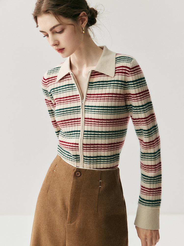 2025 Autumn/Winter Color Block Striped Slim-Fit Zip-Up Polo Cardigan Sweater