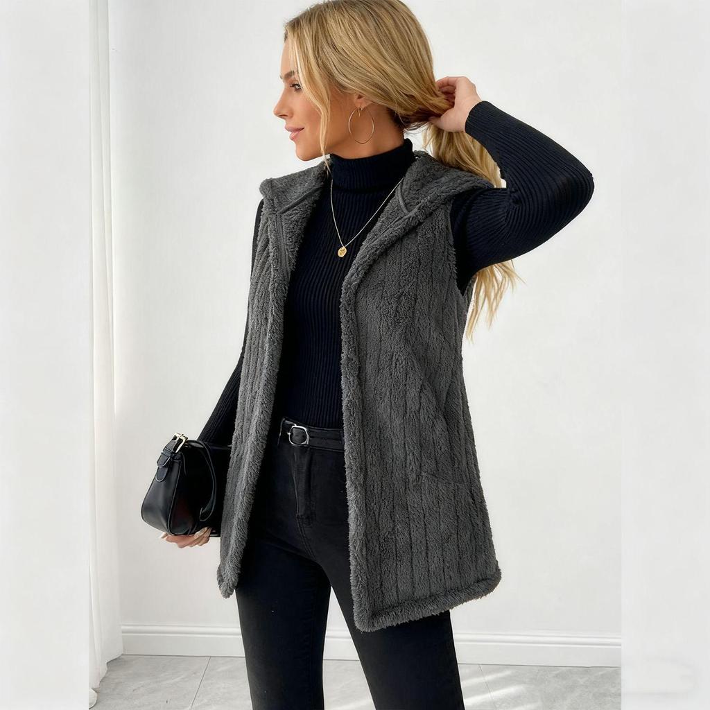 Women's Plush Hooded Long Vest - Autumn/Winter Cross-border Double-sided Open Cardigan