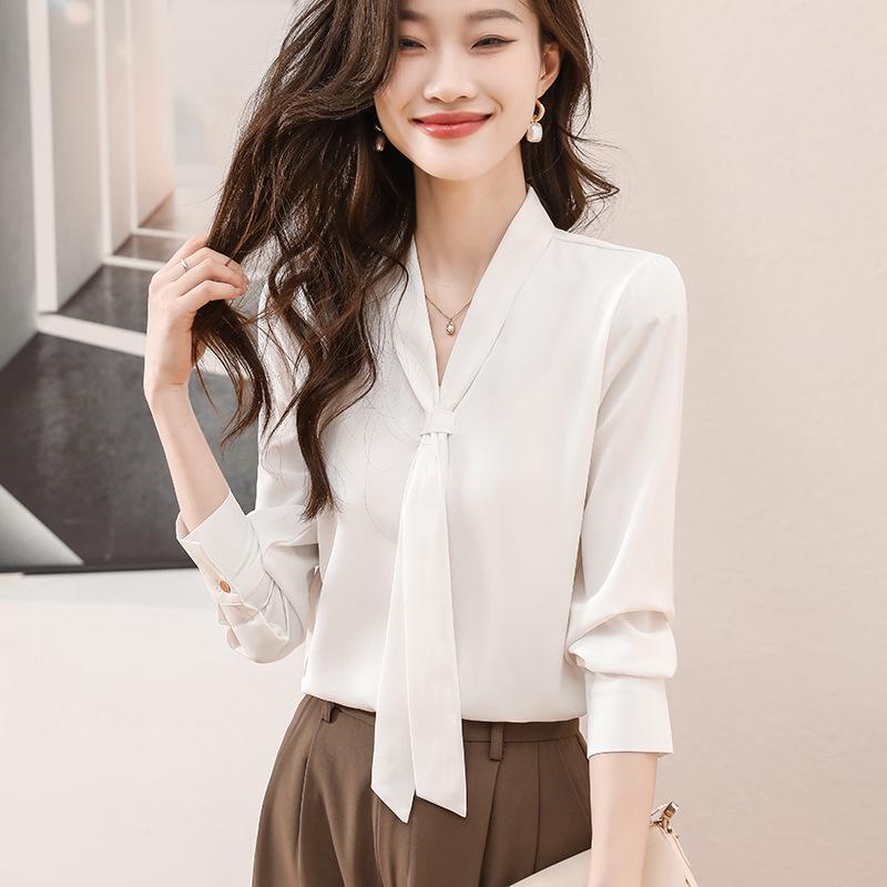 Discover effortless elegance with this charming mulberry silk shirt. Designed for both spring and autumn, its loose fit ensures comfort while maintaining a chic look. The long sleeves add a touch of sophistication, complemented by a graceful bow tie at the v-neckline. Crafted from luxurious silk, this solid-patterned piece embodies timeless style perfect for any occasion.