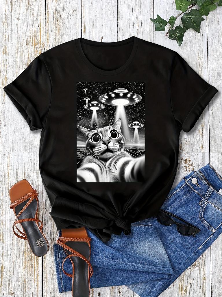 Cat's Selfie & UFO Print T-shirt, Casual Short Sleeve Crew Neck Top For Spring & Summer, Women's Clothing