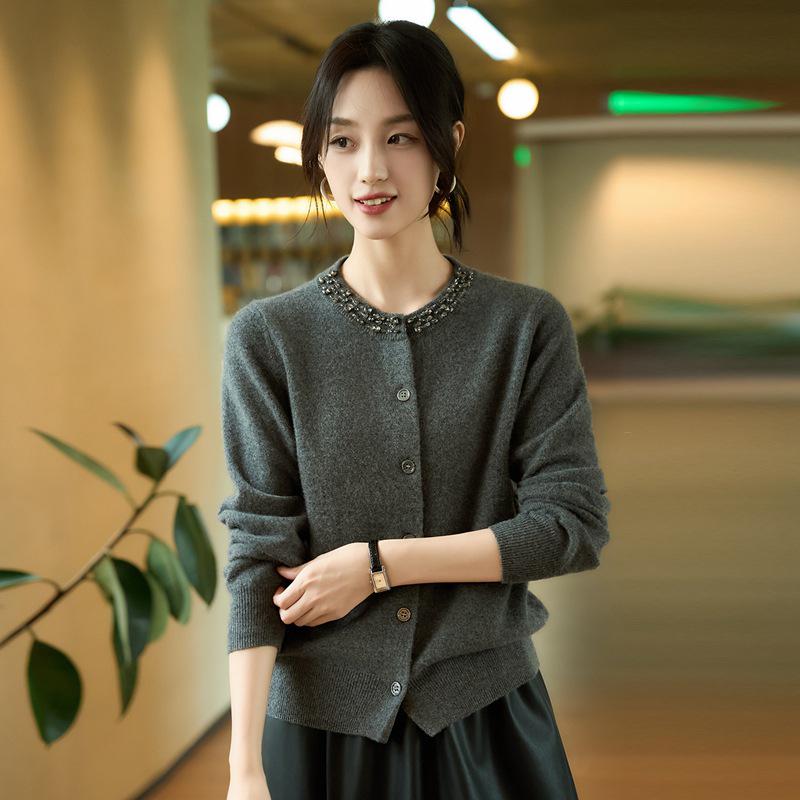 Elevate your autumn and winter wardrobe with this chic rhinestone-embellished knit wool cardigan. Designed with a flattering round neckline and cozy long sleeves, this loose-fitting sweater offers both style and comfort. Crafted from high-quality wool, it ensures warmth while maintaining a soft touch, making it an ideal choice for chilly days. The subtle sparkle of rhinestones adds a touch of elegance, perfect for dressing up or down for any occasion.