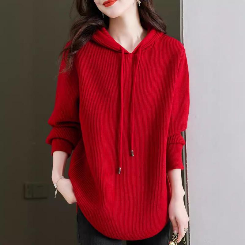 Podzim Zima Jednobarevný Volný Ležérní Pletený Top s Kapucí Dámský Vintage Stahovací Svetr