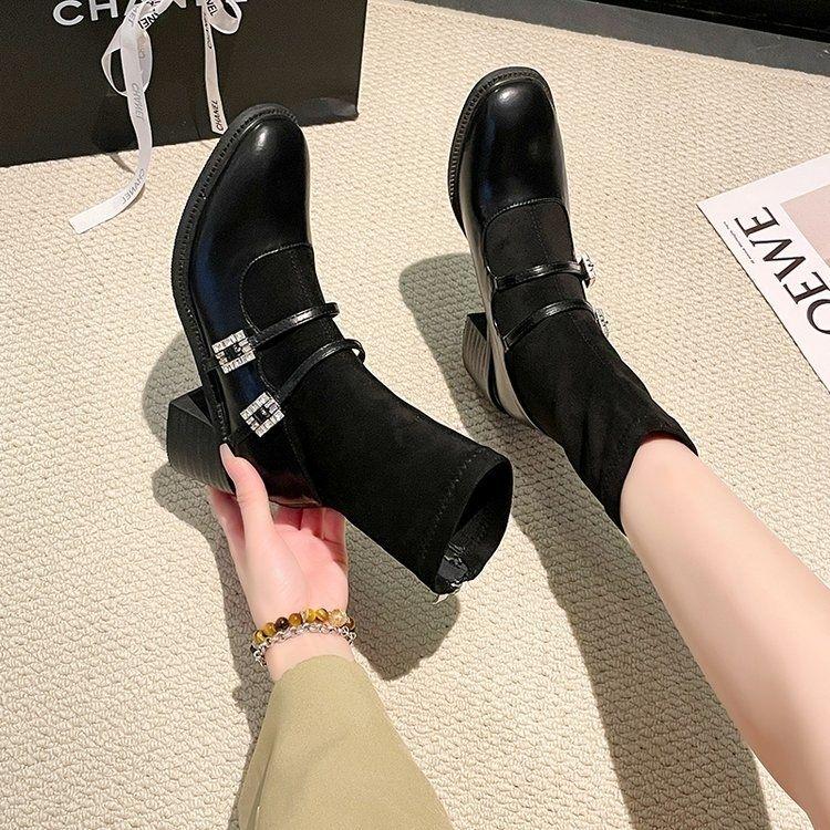 2025 Rhinestone Retro Chunky Heel Elastic Sock Boots, 5cm High, Black Mary Janes for Men