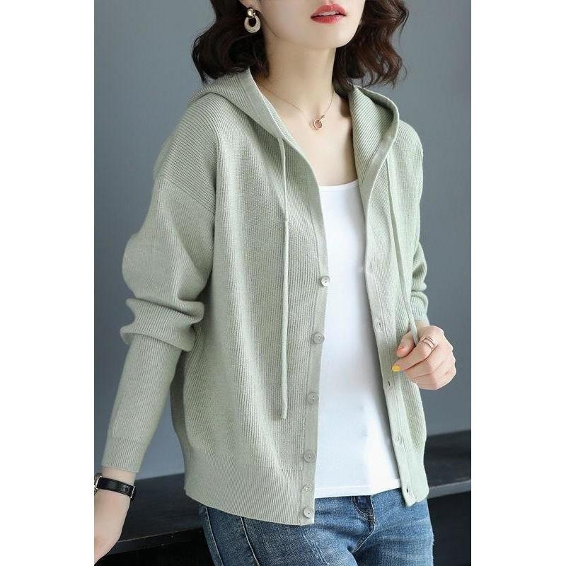 Autumn Winter Solid Color Loose Casual Buttons Knitting Coat Women Simple All-match Cardigan Hooded Top