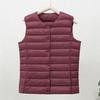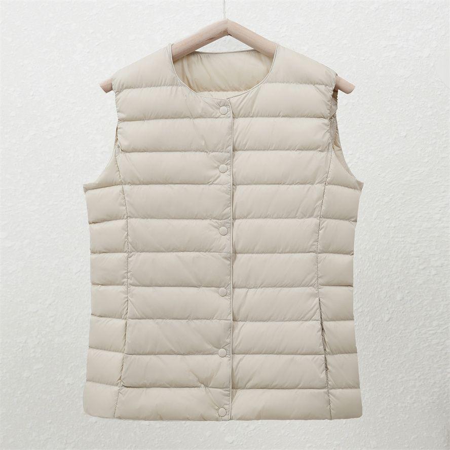 Stay cozy and stylish during the colder months with this lightweight, collarless, sleeveless vest designed specifically for women. Filled with insulating duck down, it ensures warmth without the bulk, making it perfect as an inner layer under your favorite winter jacket. Crafted with a spandex blend and luxuriously lined with chenille, this vest offers both comfort and a touch of elegance, providing the perfect balance of function and fashion for your winter wardrobe.