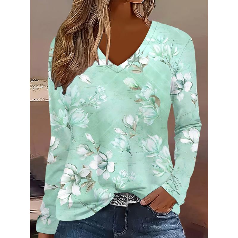 Women's Elegant V-Neck Marble Print Long Sleeve T-Shirt Soft Polyester Great for Autumn and Winter Casual Wear Floral Print Tops