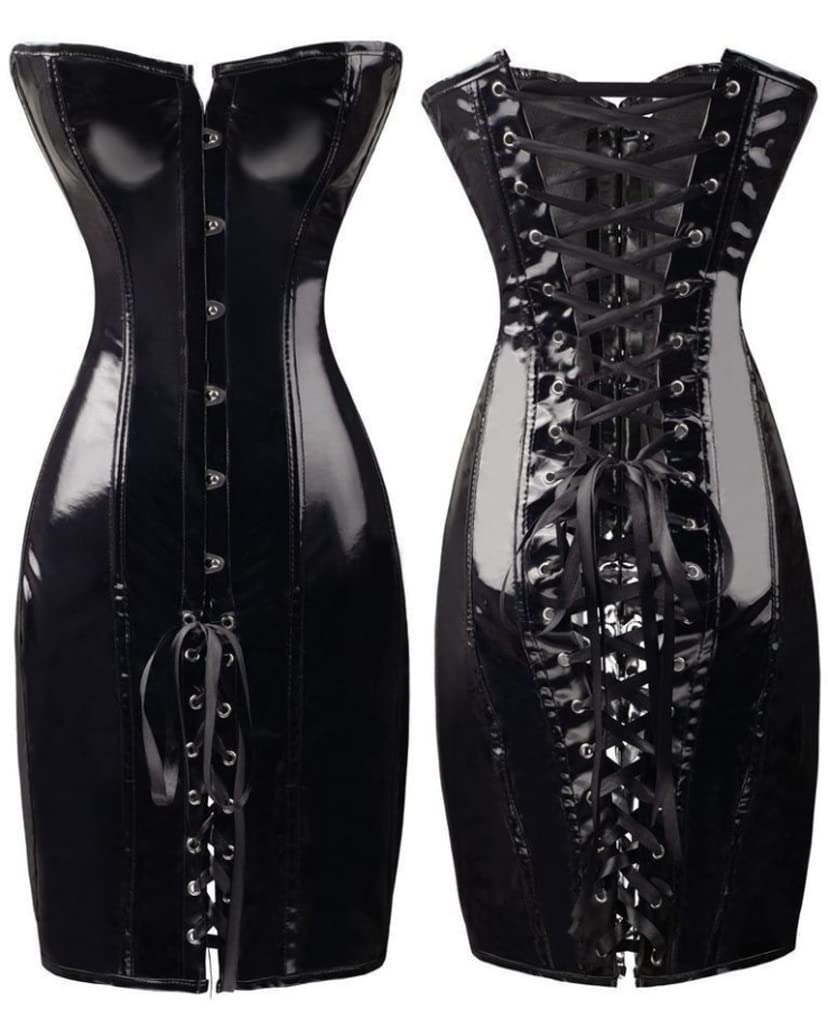 DOKiDOKi Enamel Corset Dress (Black) Lace-Up Bodysuit Cosplay Costume for SM, Dominatrix, Bondage, Punk Rock, and Sexy
