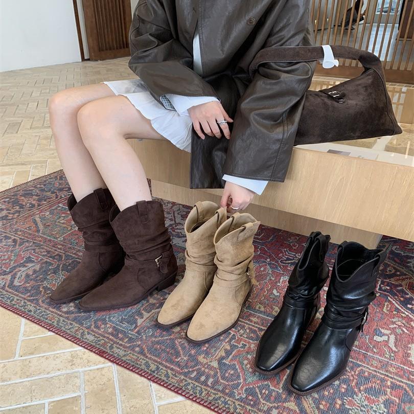 Queen Fan retro thick heel western cowboy boots women's 2025 new autumn with skirt, thin and heightened short boots