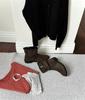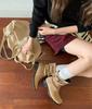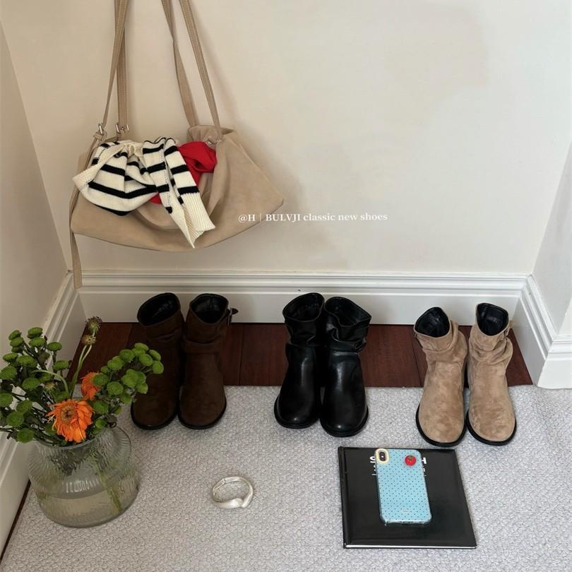 ~ Design niche western cowboy boots round head wide tube folded flat bottom belt buckle short boots women's knight boots