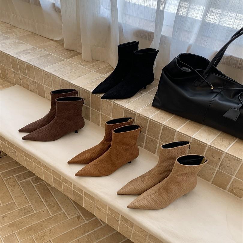 British style woven pointed toe thin heel fashion boots bare boots 2025 autumn and winter new thin versatile short boots women's and ankle boots