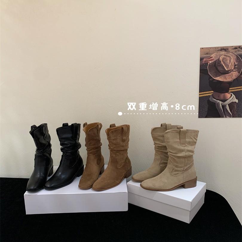 Inner Height Increasing Brown Suede V-Mouth Pile Medium Tube Martin Boots Women's Boots 2025 Autumn High Heel Short Boots Skinny Boots
