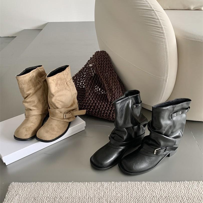 Coarse Heel Black British Medium Martin Boots Women's Boots 2025 Spring and Autumn Single Boots Western Pants Pile Pile Short Boots