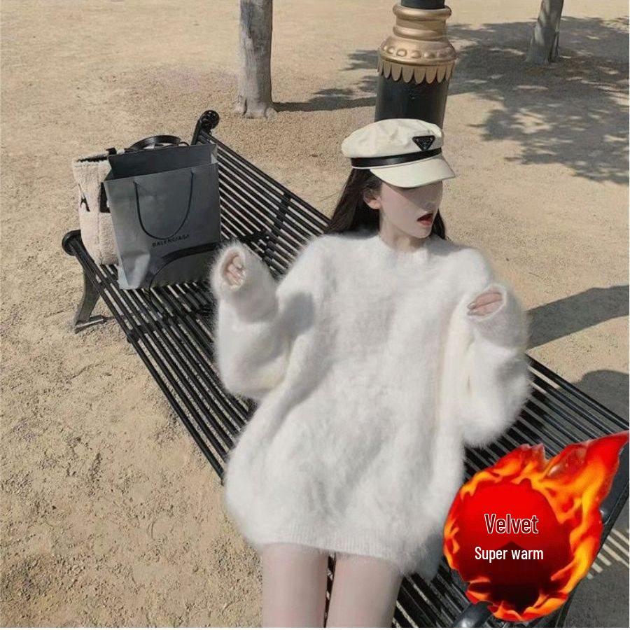 Dámský středně dlouhý kašmírový svetr z norkové příze 2025: Podzimní/Jarní Volný, Fleecem Podšitý, Silný Pletený Kardigan