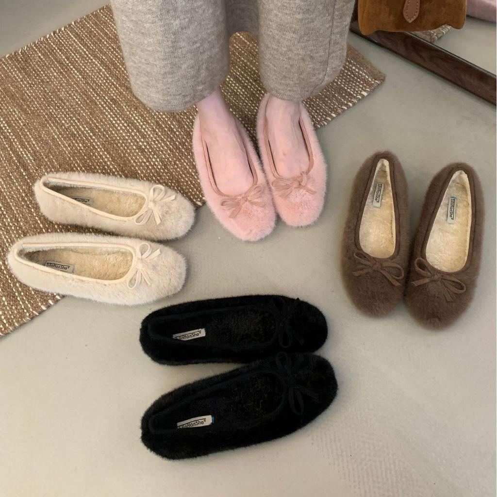 2025 podzim a zima nové hranaté norkové chmýří fleece mašle silná podrážka balerínky dámské jednoduché boty plochá podrážka