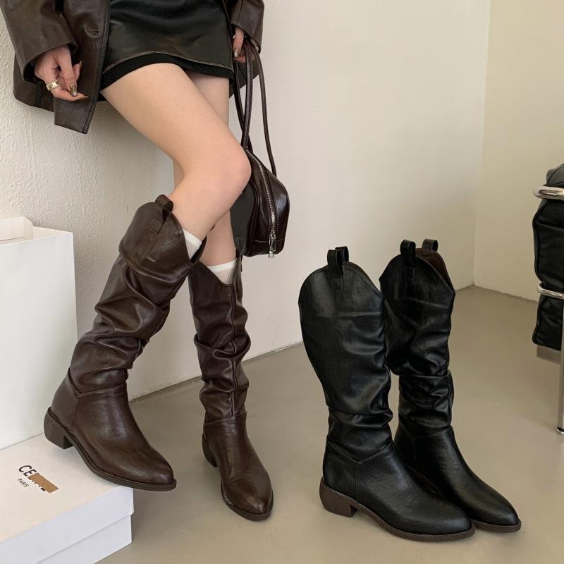 Coarse heel boots women's 2025 new autumn and winter pointed brown Maillard V-mouth thick-soled stacking boots boots