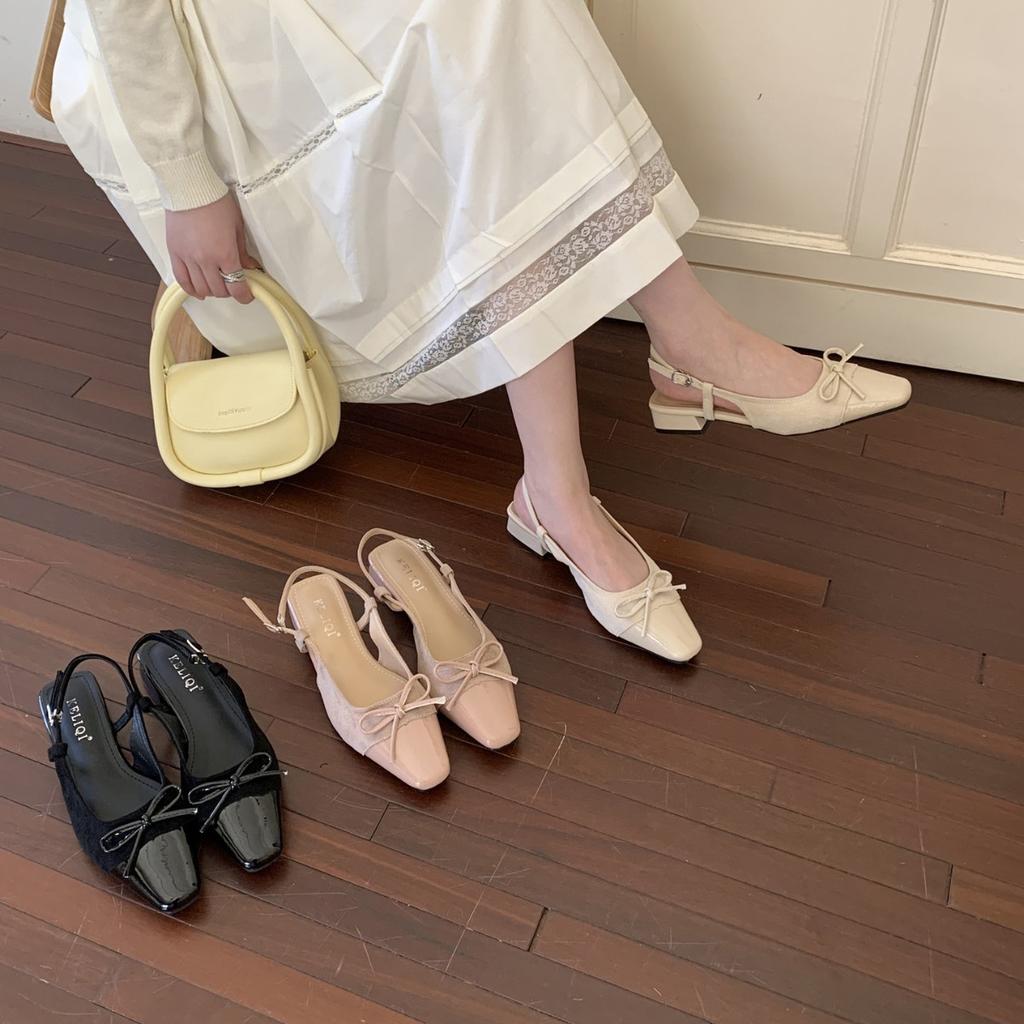 2025 new French one-word with hollow knot thick medium heel shallow mouth versatile fashion women's shoes