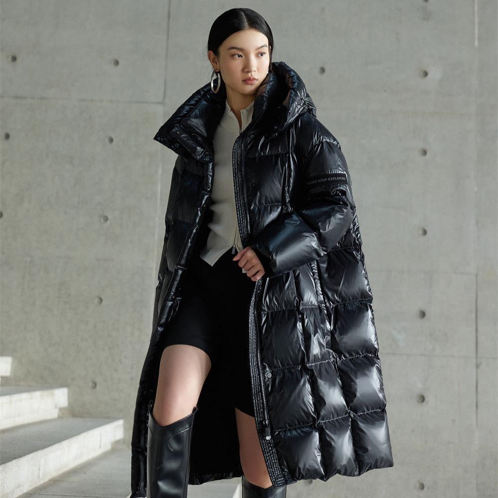 Luxusní péřová bunda střední délky s kapucí Black Diamond s 90% prachovým peřím z bílé kachny, stahovací šňůrkou, nad kolena, silný větruodolný design