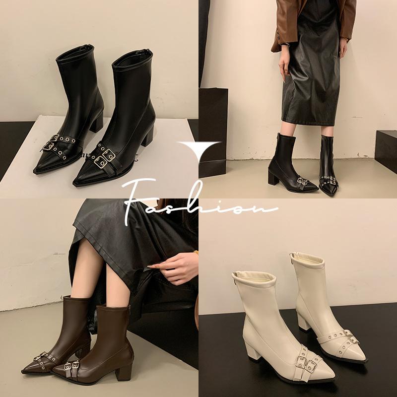 Dámské špičaté kotníkové boty na silném podpatku Podzim Zima Pohodlné Měkká kůže Krátké boty Dámské Jednobarevné Nazouvací Botas Mujer