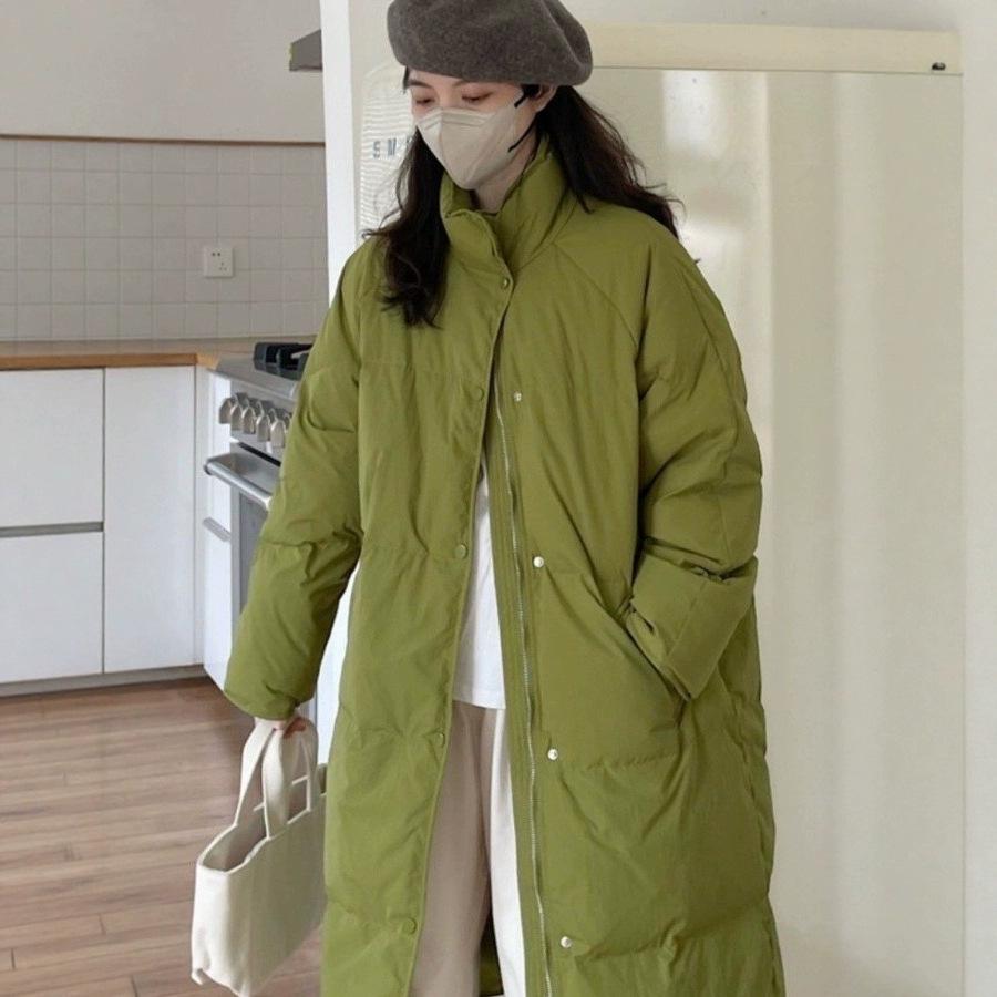 Women's Korean Style Mid-Length Down Jacket - Solid Color, Stand-Up Collar, Loose Fit, Warm Winter Coat.