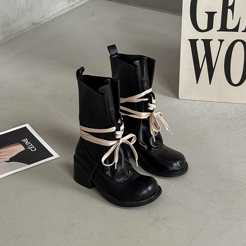 Autumn Winter Corss Strap Women Mid Calf Boots Fashion Slip On Square Heels Shoes Female Modern Trouser Legs Booties