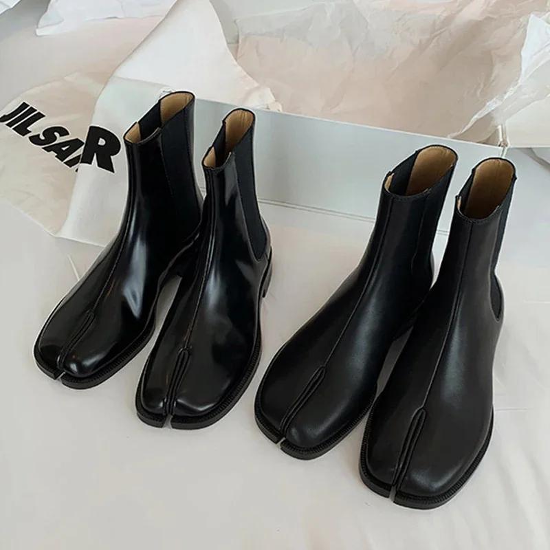 Retro kotníkové boty s dělenou špičkou Dámské lesklé a matné kožené boty Tabi Ninja Chelsea Botas Mujer Nízké podpatky Trotters Boots Zimní