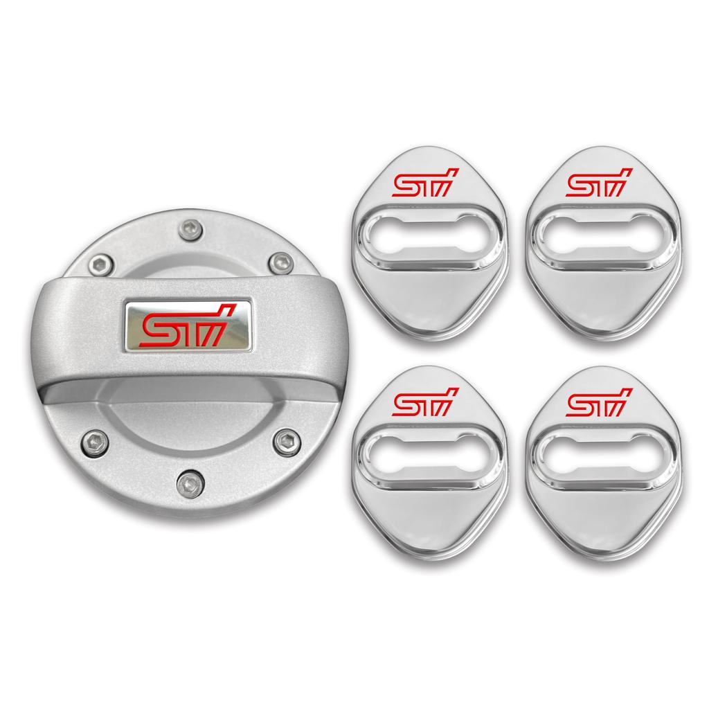 STI Subaru Gasoline Fuel Spout Cap Cover, Fuel Cap Cover, Door Striker Cover, Door Lock Cover, Paste Type Set (Silver)