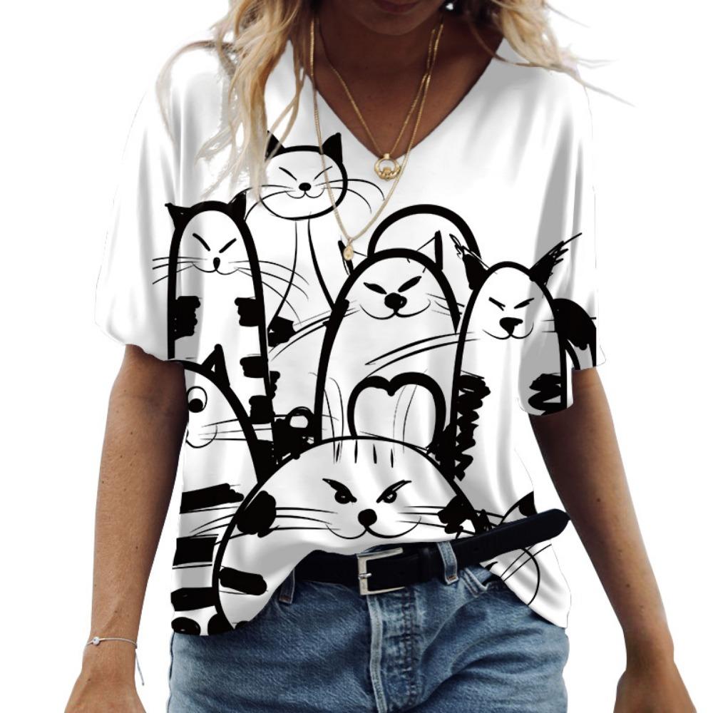 3D V-neck Women's T-shirt Cute Cat Pattern Printed Short Sleeve Summer Kawaii Fashion Casual T-shirt Funny Women's Wear