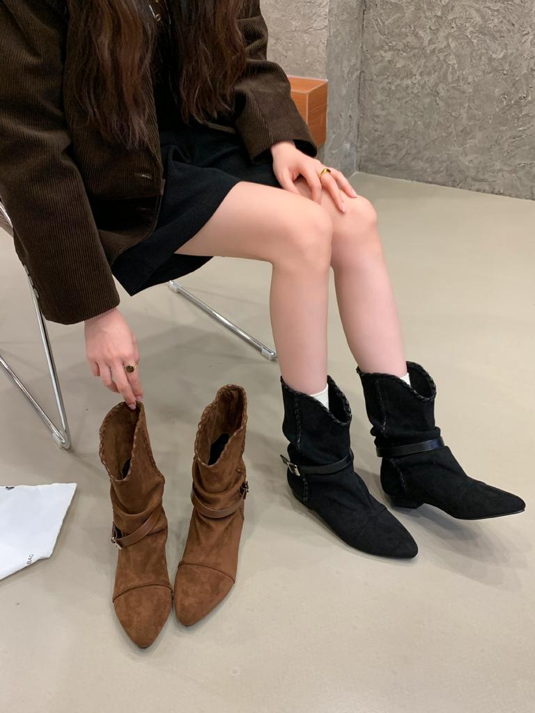 Vintage matte leather pointed pleated pile boots 2025 new single boots square heel short western cowboy boots women