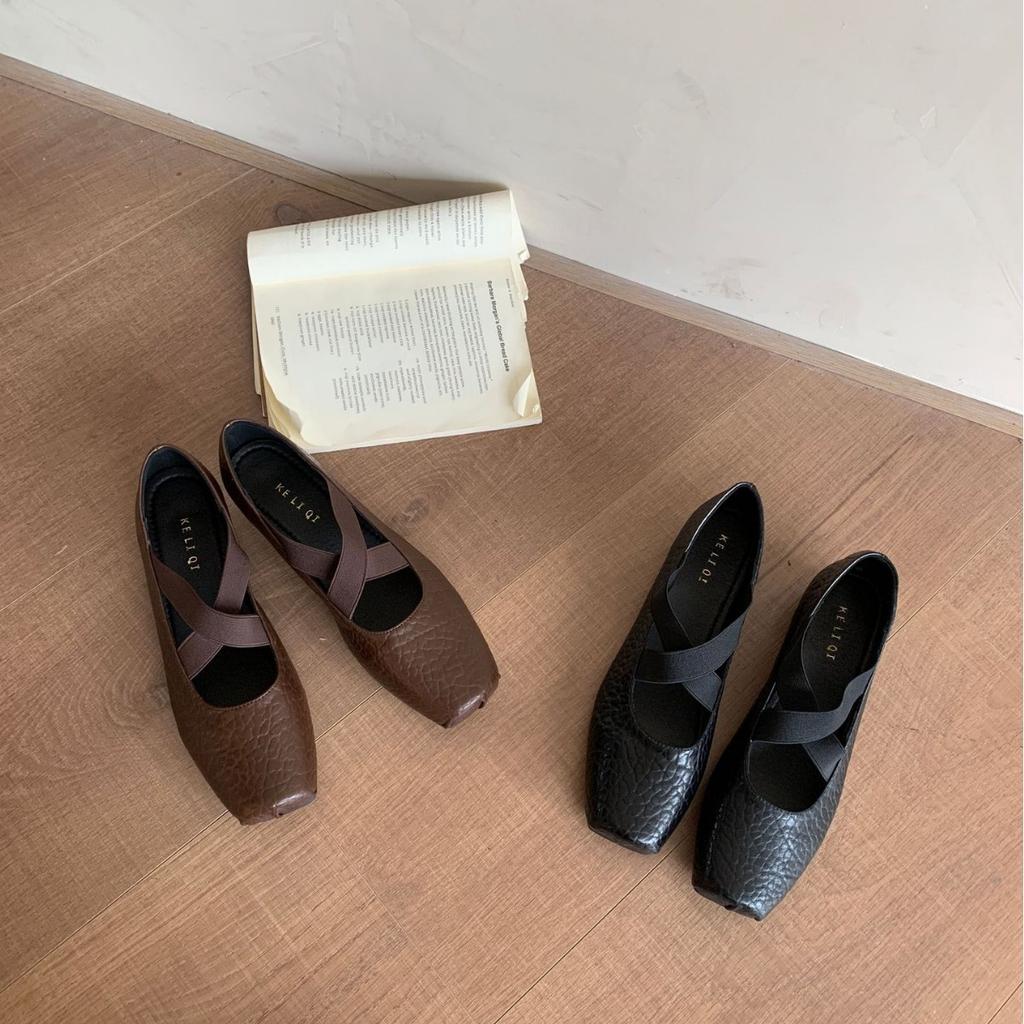 2025 new autumn shallow mouth one-word cross belt elastic band granular pattern ballet pig nose ballet women's single shoes