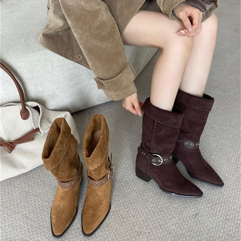 White Deer Same Zhong Chuxi Zhao Ruth Bread Tree Knight Boots Folded Western Pile Boots Long-Term