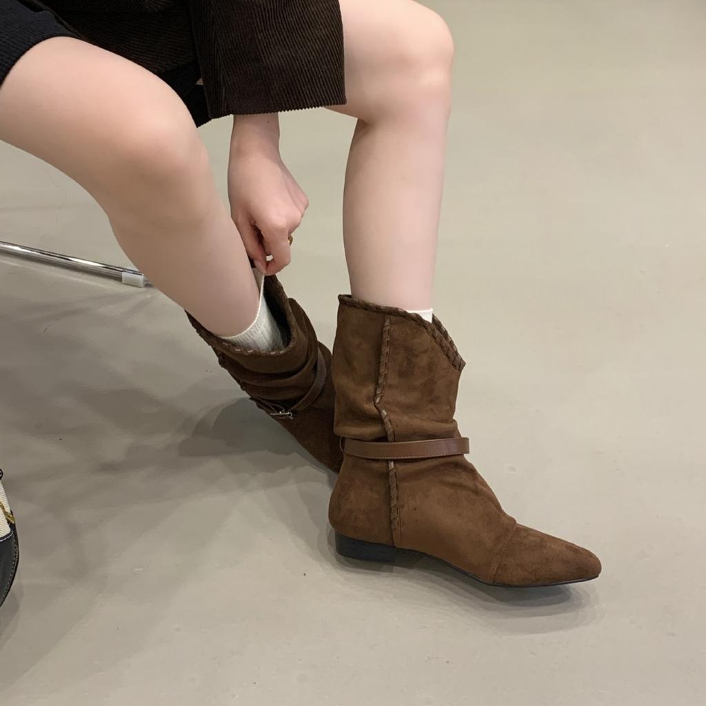 2025 autumn new belt buckle thick low tube thin suede versatile Martin fashion women's short boots
