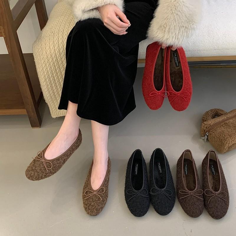 Flat bottom square head bow woolen single shoes women's 2025 autumn and winter new cotton shoes plush grandma shoes Korean version of woolen shoes