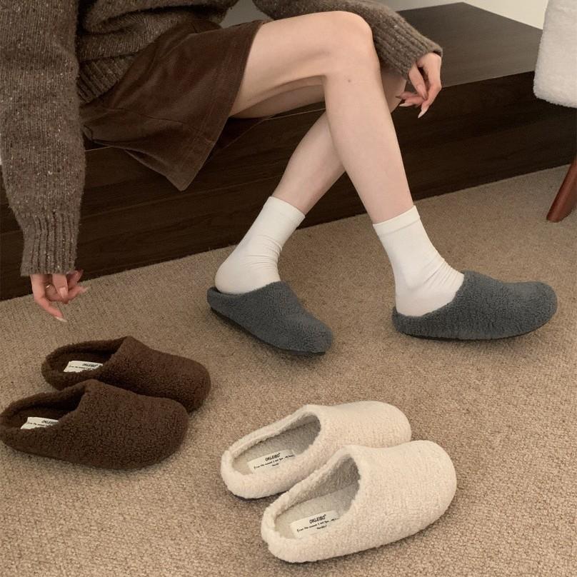 Baotou outer wear cotton slippers, one pedal, velvet to keep warm, big head retro confinement fluffy slippers, home leisure half drag