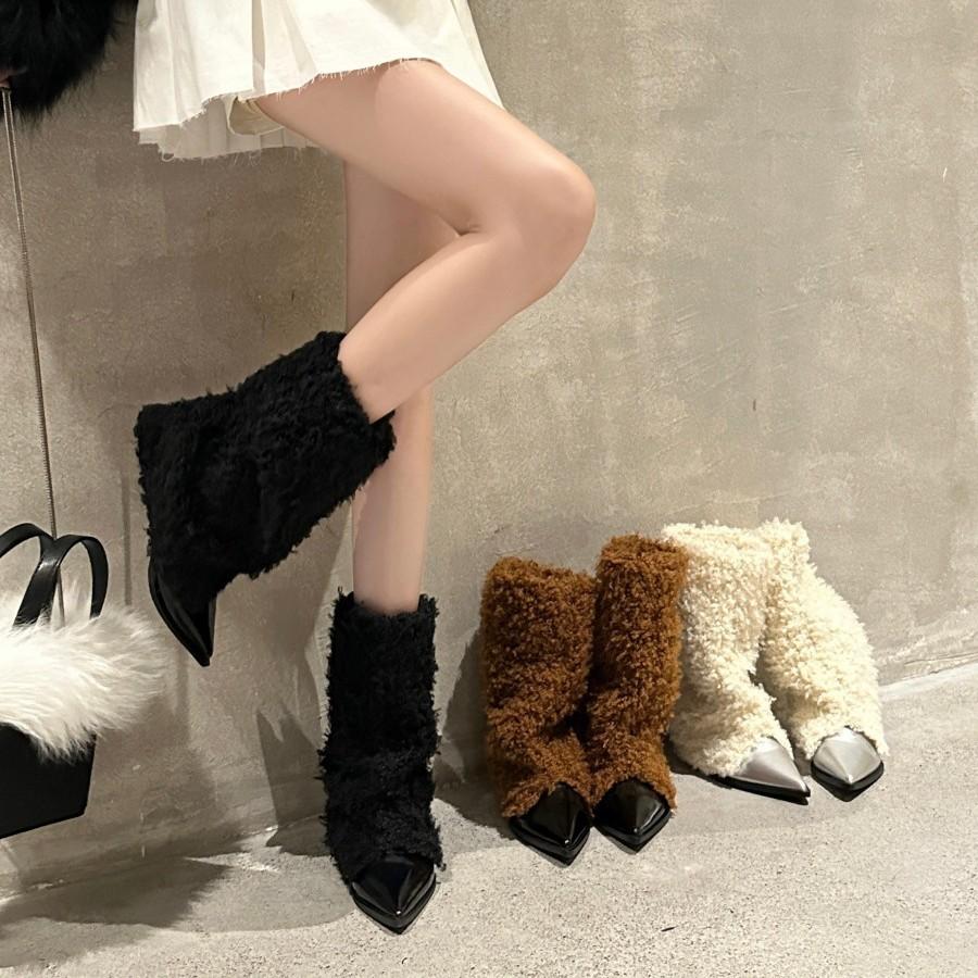 Sheep curly splicing pointed short boots 2025 autumn and winter new fashion versatile women's boots Internet celebrity fashionable middle heel fashi