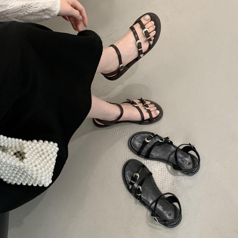 2025 summer new retro one-word buckle with flat sandals women's low-heeled beach shoes open-toed Roman women's shoes