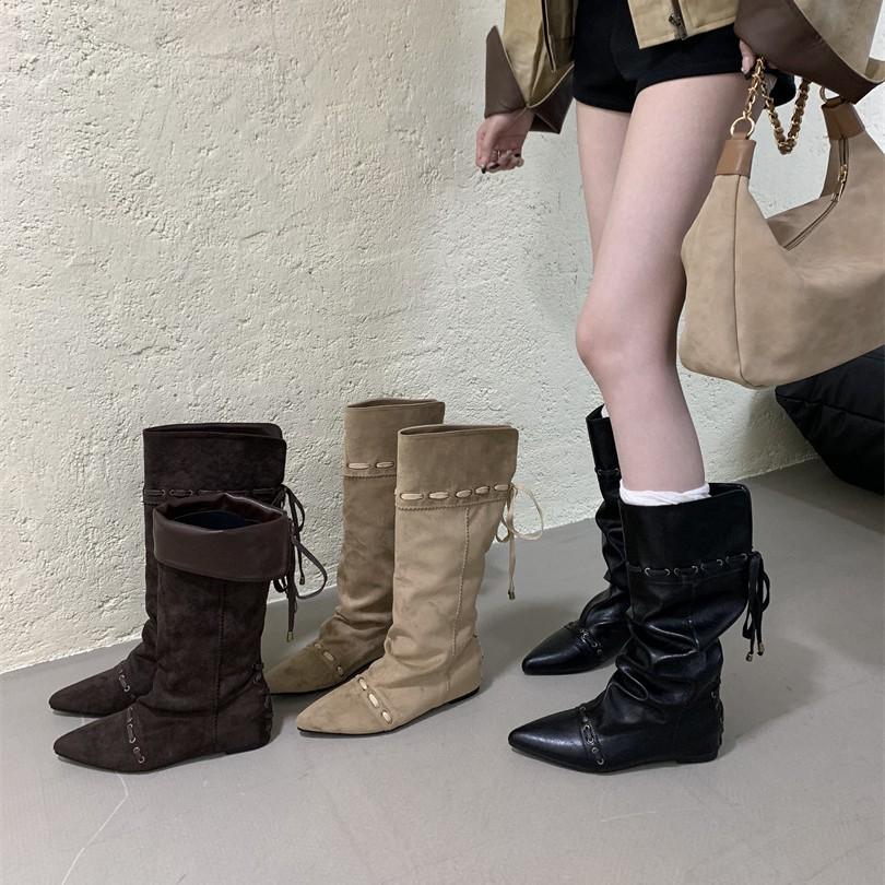 Retro inner pointed high boots, new string straps, versatile pleated thin boots, folded and two stacked boots