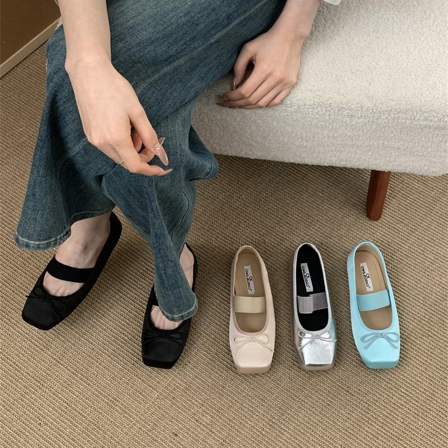 Flat-bottomed French square head small silver single shoes women's shoes 2025 new spring satin ballet gentle