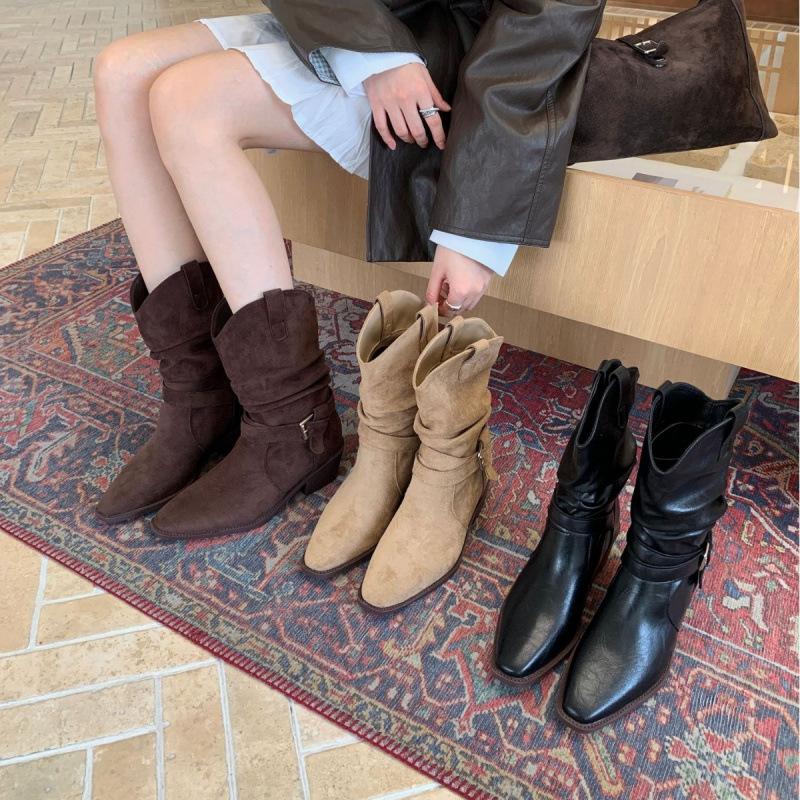 2025 autumn and winter Martin boots V mouth slim small square head retro thick heel belt buckle short boots women Maillard