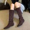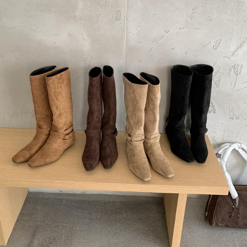 Retro pointed suede belt buckle but knee trouser boots women's long pile boots