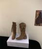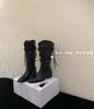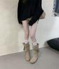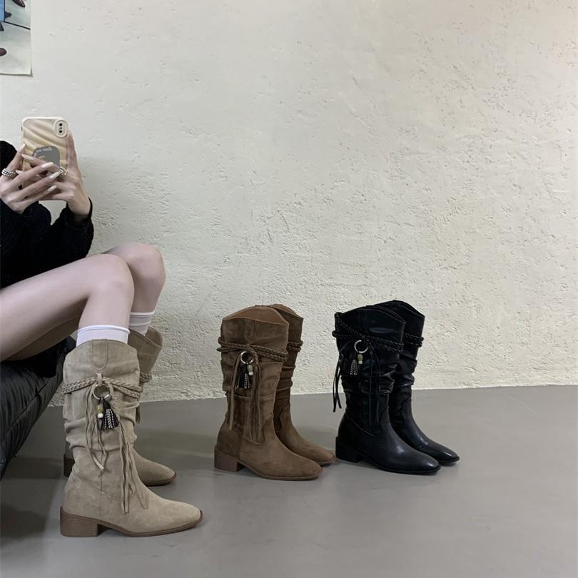 Vintage woven fringed thick heel tall boots 2025 autumn and winter thin pointed western cowboy boots stacking boots