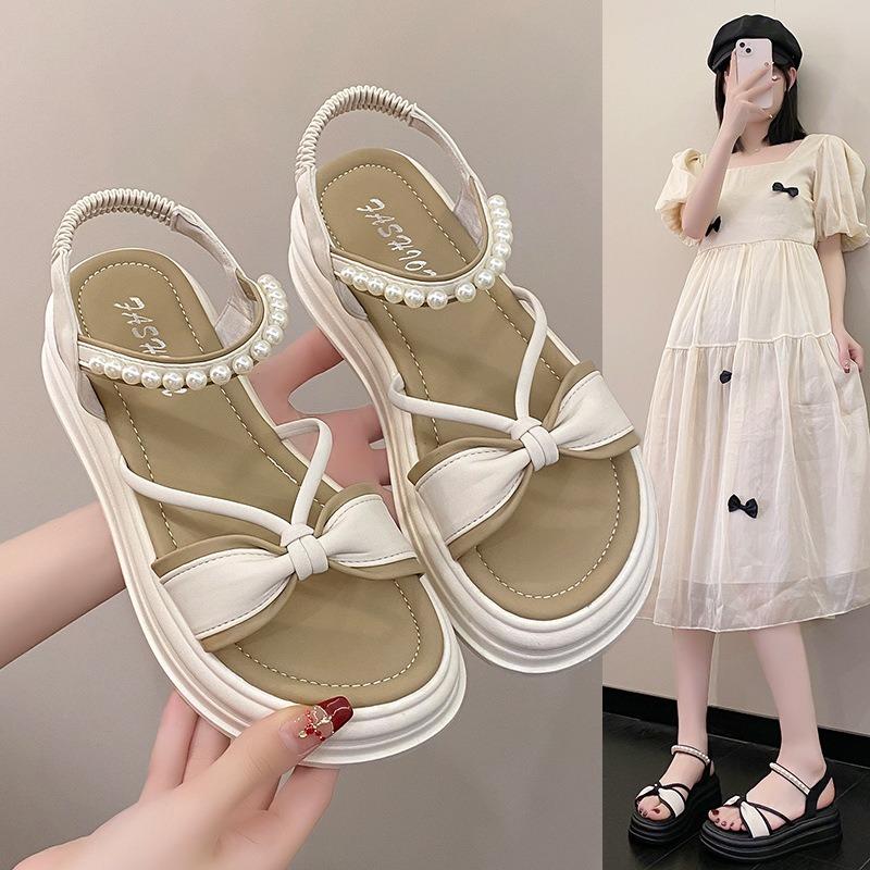 Flat-soled sandals women's summer new pearl casual trendy with one-word belt beach shoes children