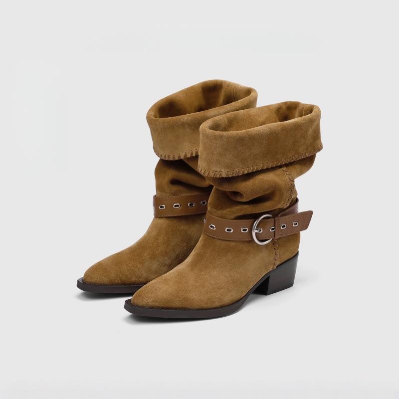 Retro mid top pointed boots autumn/winter new solid color knight boots mid heel pleated western cowboy boots