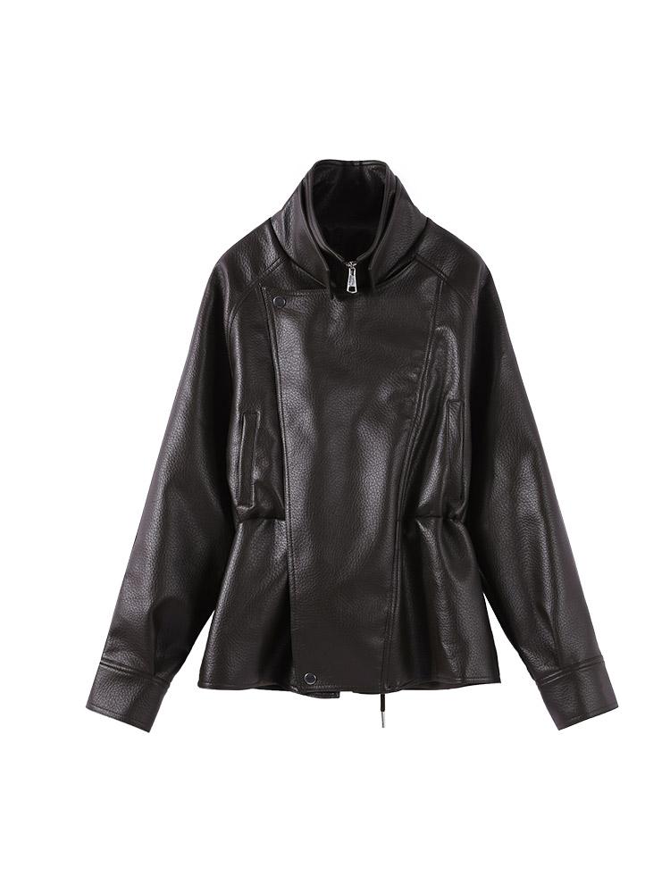 Ladies' Waist Cinched Lapel Leather Jacket Women's Brown Zipper Leather Jacket Windproof Jacket Fashion Style Autumn and Winter