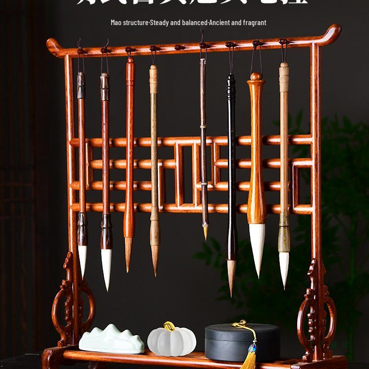 Rosewood Calligraphy Brush and Pen Holder - Solid Wood Rack for Study Treasures