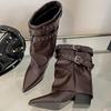Autumn Vintage Thick Heel Women Western Cowgirl Boots Fashion Belt Buckle Ladies Elegant Slip On Mordern Mid Calf Booties