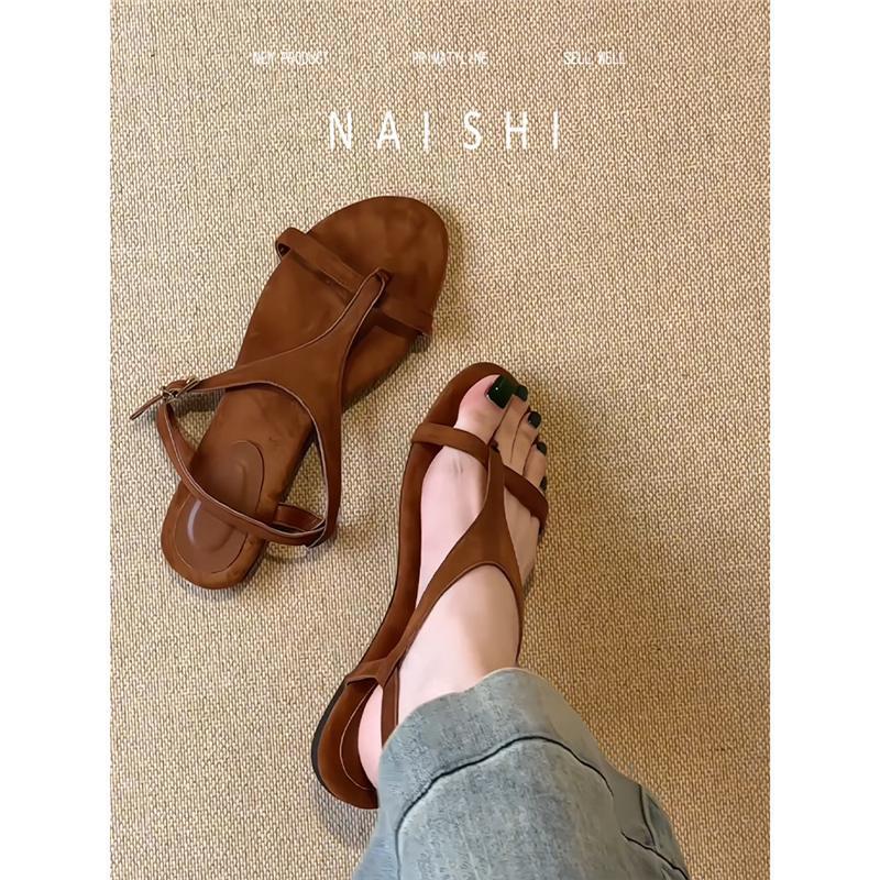 Sheepskin version! Korean version of the design sense flat sandals women's word with retro toe Roman sandals casual beach shoes