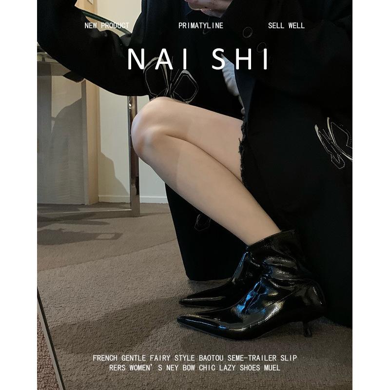 Sheepskin version! French pointed toe bare boots temperament kitten and black short boots women's side zipper elastic thin boots thin heel