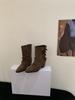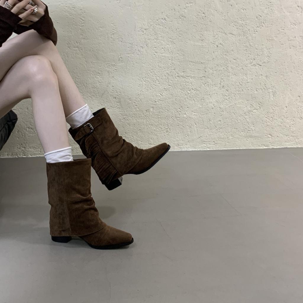 European and American retro suede fringed thick heel medium boots women's autumn and winter new niche belt buckle fashionable versatile trouser